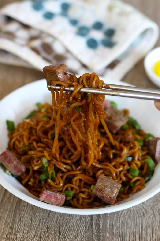 For Meat: Because I used decent quality beef, I chose to cook the beef separately in a skillet. I tossed the cooked meat on top of the cooked noodles and mixed lightly. Top with green onions, sesame seeds, or whatever you want honestly.